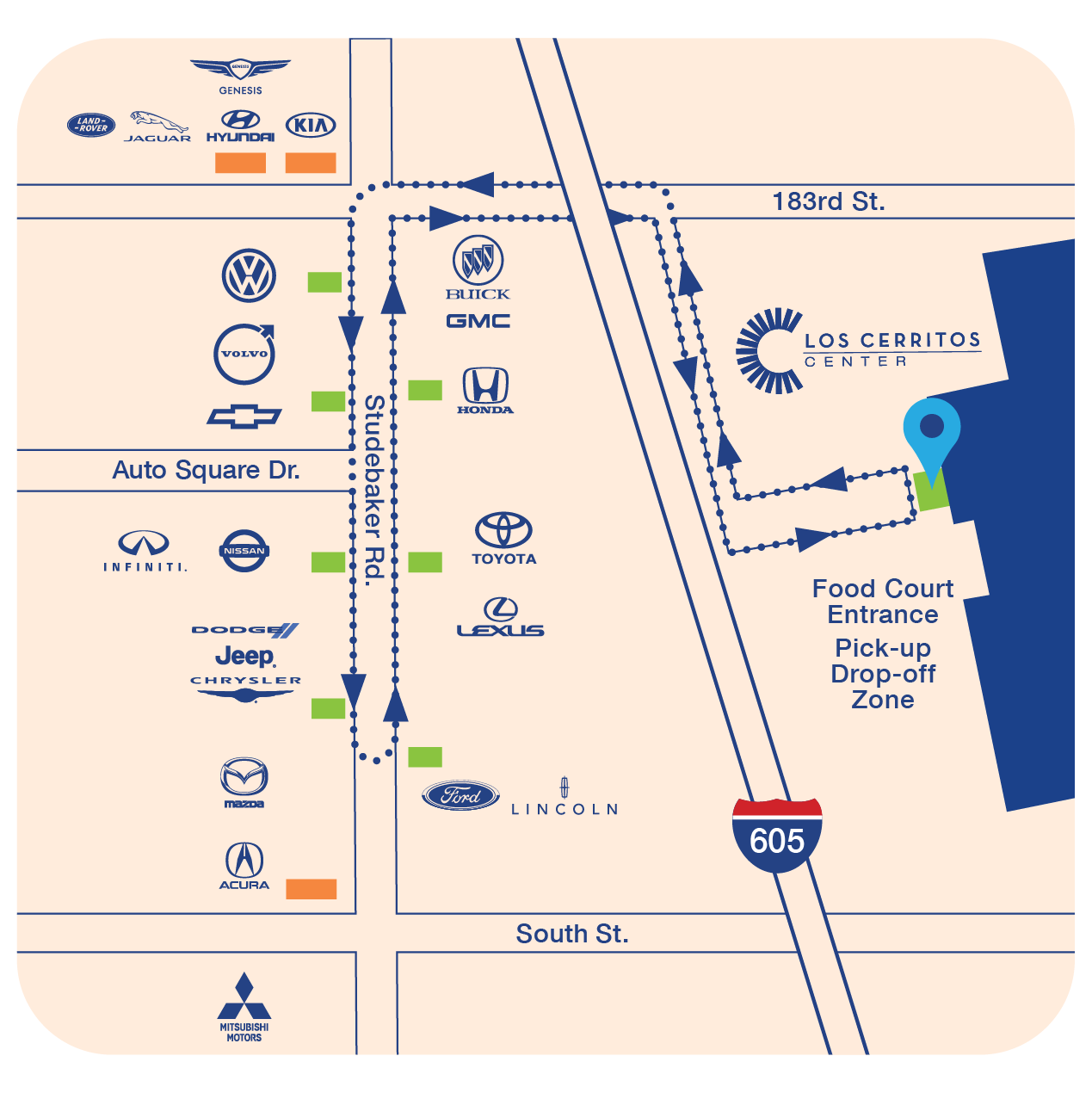 - To return, wait outside the food court entrance to the mall. Please remind your driver which dealership to drop you off at.